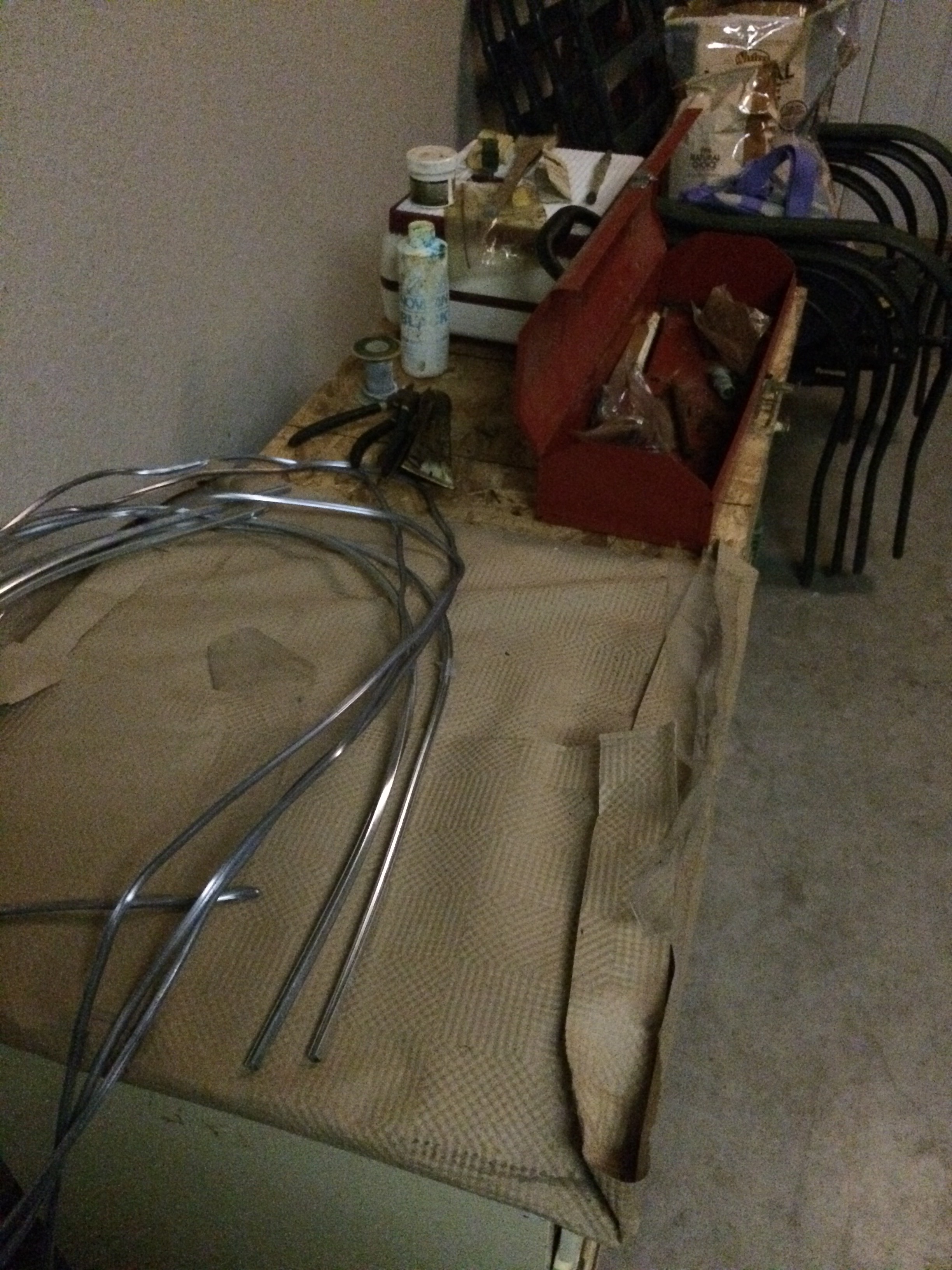 It’s a start. This is the beginnings of the studio I’m assembling in my garage. I’ve got some very pretty glass, some lead and solder. Everything is old and dirty but I love it! Hoping to get some solder practice in tomorrow.