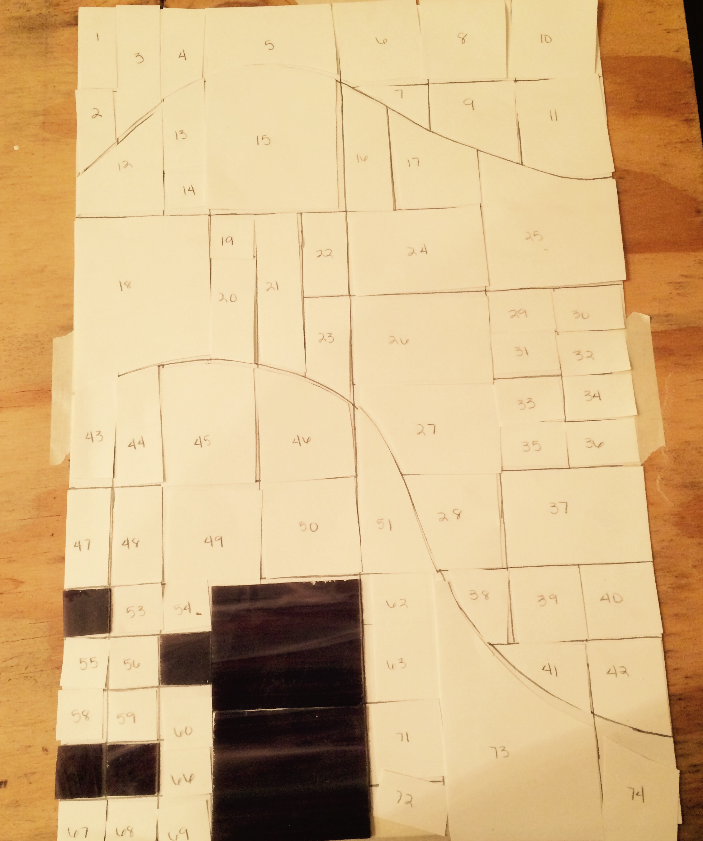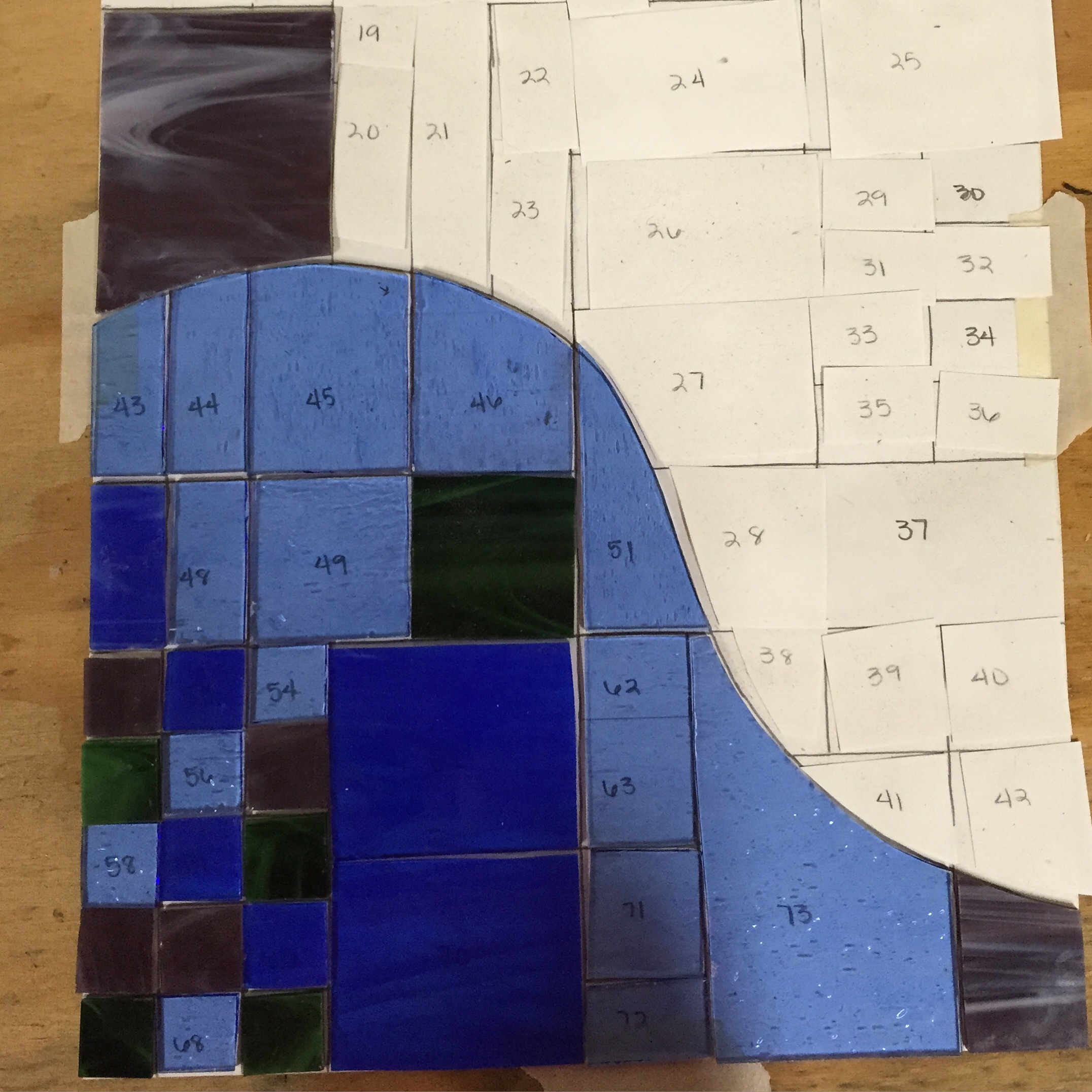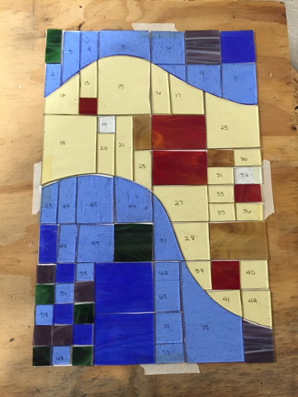I am behind on updates but have a couple of pictures to share on the mosaic window piece on which I am working. I find it hard to work on a continuous basis and find myself going weeks with any progress and then getting a lot done in a short period of time. I don’t like it but maybe that’s just the way these things work.